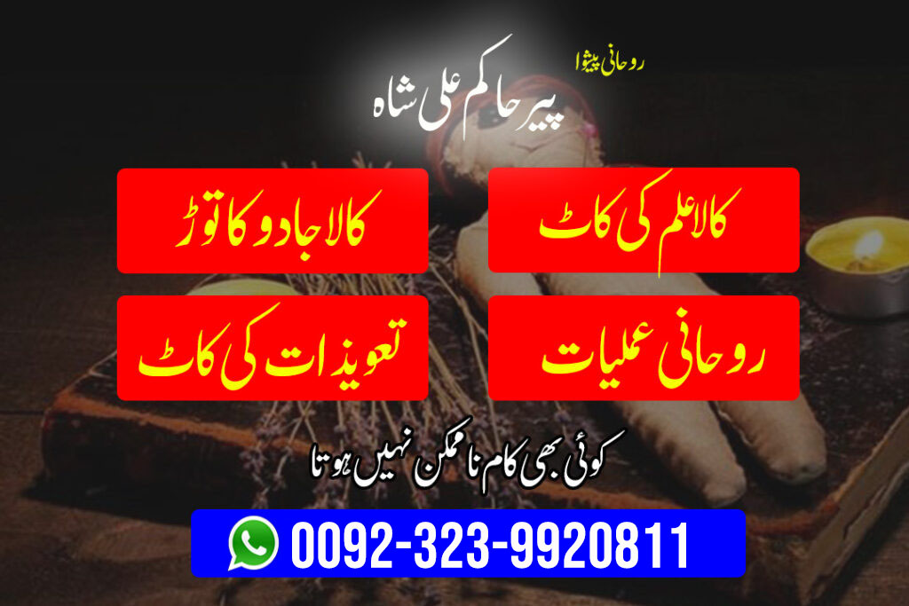 Black magic (kala jadu) jo ke kisi ko nuqsan pohnchane ke liye kiya jata hai. kala jado kisi ki bhi life me helth issue ke sath na khushgawar tabdeliyan la sakta hai. jese helth issues, rohani problems, reltionship problems, business problems or beshumar qisam ki problems paida kr skta hai. Kala jadu ka tor ke mahir jin ko hum black magic removal expert ya black magic protectors bhi kehte hen. un se hum kala jadu ka tor krwa sakte hen. ager ap ko black magic kala jadu ki alamat ya shak ho to filfor black magic expert Peer Hakim Ali Shah se rabta kar sakte hen or in mushkilat se nijat hasil kar sakte hen.