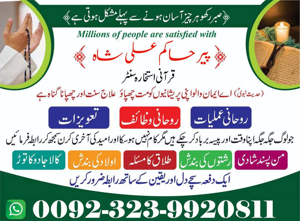 روحانی پیشوا پیر حاکم علی شاہ ایک معروف روحانی رہنما اور مشہورروحانی عامل ہیں جنہوں نے اپنی زندگی روحانی علوم اور لوگوں کی خدمت کے لئے وقف کر دی ہے۔ ان کی تعلیمات اور رہنمائی نے بے شمار لوگوں کی زندگیوں میں مثبت تبدیلیاں لائی ہیں۔ پیر حاکم علی شاہ اپنی روحانی بصیرت اور تجربات کی بنیاد پر لوگوں کو مشکلات سے نجات دلانے، مسائل کا حل پیش کرنے، اور روحانی سکون حاصل کرنے میں مدد فراہم کرتے ہیں۔ پیر حاکم علی شاہ کا طریقہ کار منفرد اور مؤثر ہے۔ وہ قدیم روحانی علوم اور اور قرآن و حدیث کی روشنی میں لوگوں کو بہترین مدد اور مشکلات کا حل فراہم کرتے ہیں، جس کے ذریعے وہ مختلف مسائل کا حل حاصل کرتے ہیں۔ چاہے وہ محبت کے مسائل ہوں، جادوئی مشکلات، یا صحت کے مسائل، گھریلو مسائل ، میاں بیوی کا مسلہ ، رشتوں کی بندش ، طلاق کا مسلہ یا کسی بھی قسم کا کوئی بھی مسلہ ہو پیر حاکم علی شاہ کے پاس ہر مسئلے کا حل موجود ہے۔ ان کی خدمات میں دعا، تعویز، وظیفے، اور روحانی مشاورت شامل ہیں، جو نہ صرف آپ کی موجودہ مشکلات کو دور کرتی ہیں بلکہ مستقبل کے لئے بھی راہنمائی فراہم کرتی ہیں۔ روحانی پیشوا پیر حاکم علی شاہ کی روحانی بصیرت اور مہارت نے انہیں نہ صرف پاکستان بلکہ دنیا بھر میں مشہور کر دیا ہے۔ اگر آپ اپنی زندگی میں کسی بھی طرح کی مشکلات کا سامنا کر رہے ہیں اور روحانی سکون کی تلاش میں ہیں، تو آپ پیر حاکم علی شاہ کی خدمات سے فائدہ اٹھائیں۔ ان کی روحانی رہنمائی آپ کو زندگی کے ہر موڑ پر صحیح فیصلہ کرنے میں مدد دے سکتی ہے اور آپ کو خوشحال اور مطمئن زندگی گزارنے کا موقع فراہم کر سکتی ہے